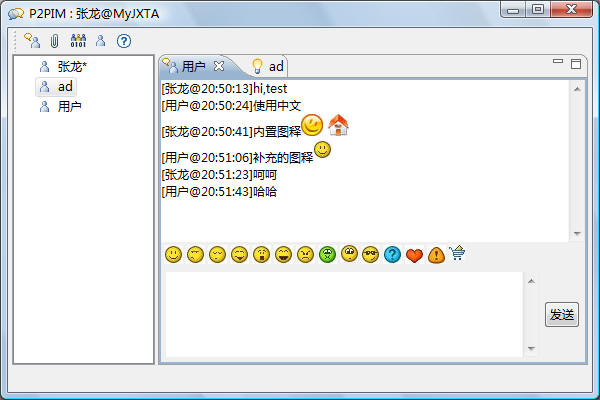 整个界面分为三部分,上面是工具栏,左边是好友列表,右边是聊天窗口。工具栏图标功能如下: