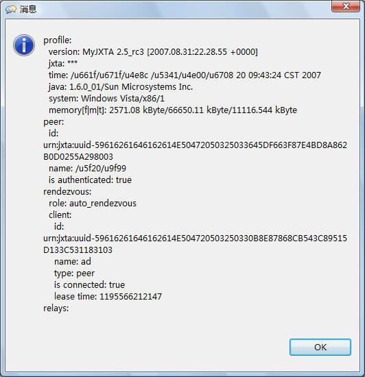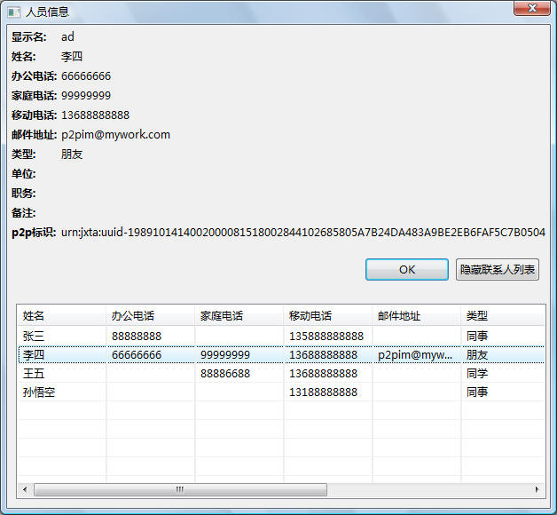 显示选中好友在jxta网络节点中的主机、软件、peer、rendezvous等信息。